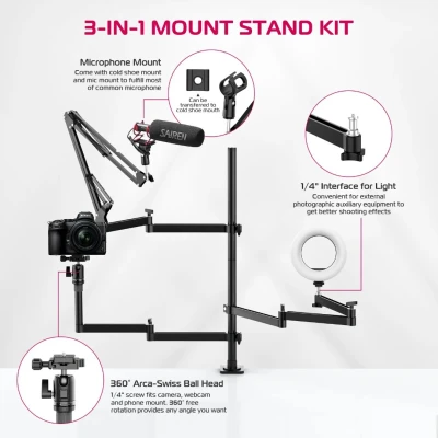 ULANZI Support de bureau robuste pour appareil photo avec bras flexible à 3 niveaux, support de bureau avec tête sphérique rotative à 360°, équipement YouTube TikTok en aluminium pour