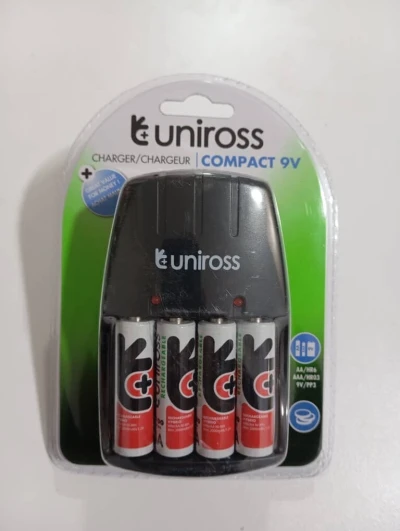 Chargeur Uniross Compact ( AA / AAA / 9V ) + 4 X AA 2100mAh Marque: Uniross Référence: UCW001A Couleur: Noir Tension de sortie: 9 V Tension d'entrée: 120 V Compatible battery: AA, AAA, 9V
