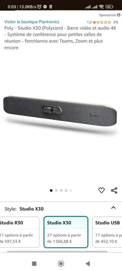 Poly - Studio X30 (Polycom) - Barre vidéo et audio 4K - Système de conférence pour petites salles de réunion - fonctionne avec Teams, Zoom et plus