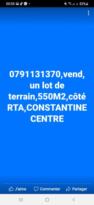 Met en vente, un lot de terrain, 550M2,côté RTA ET CLINIQUE DOCTEUR NAMOUS,AVEC ACTE. Pour plus d'informations contactez l'agence. Agences et intermédiaires s'abstenirs.