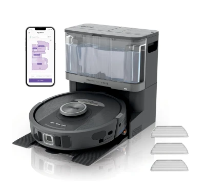 L'aspirateur robot laveur Shark Power Detect Never Touch 2-en-1 RV2800YEEU nettoie tous types de sols grâce à des technologies de nettoyage intelligentes, puis retourne à sa station de ba