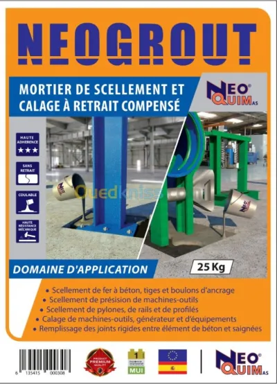Neogrout est un mortier hydraulique prêt à l'emploi composé de charges sélectionnées, de ciment de haute résistance et d'adjuvants spéciaux. Après gâchage, on obtient un mortier