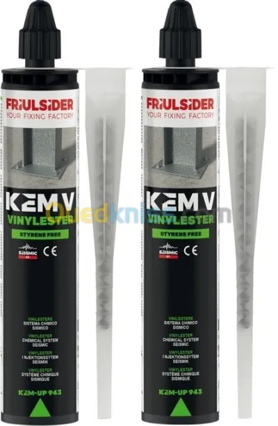 PRIX PROMOTIONNEL & ATTRACTIF MORTIER DE SCELLEMENT CHIMIQUE KEM V - VINYLESTER FRIULSIDER ITALIE Performance sismique catégorie C1 Résistance aux charges cycliques Certifié pour l'