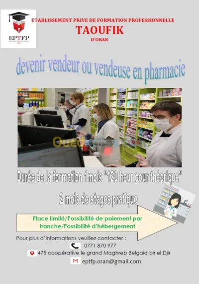 _ Etablissement Privé de formation professionnelle Taoufik Lance sa quatrième promotion une formation dans : √vendeuse ou vendeur en pharmacie + √ Secouriste _2 diplomes