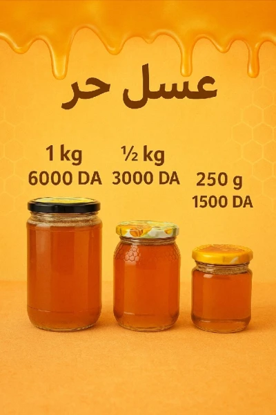 متوفر عسل حر ذو جودة عالية المصدر ولاية جيجل المكان المدينة الجديدة علي منجلي عبوة 1 كغ = 6000دج عبوة نصف ك