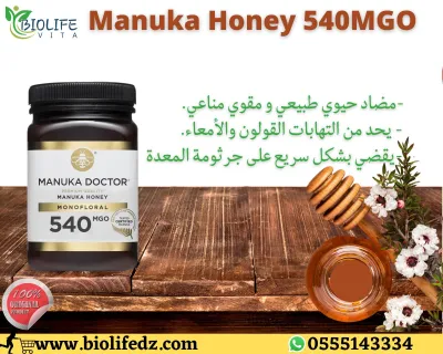 ✅ عسل مانوكا هو نوع خاص من العسل الطبي بتركيز MGO 540، وينتجه فقط النحل الذي يتغذى على رحيق وحبوب لقاح أزها