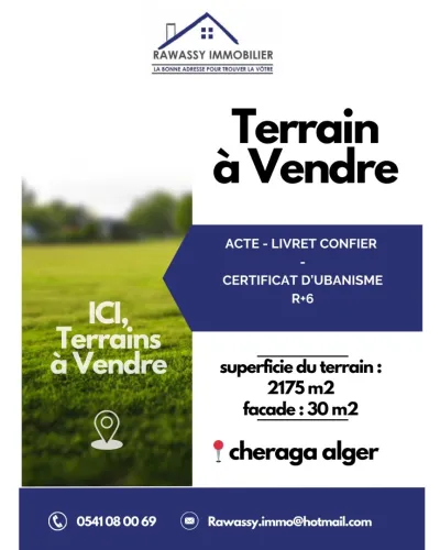 Rawassy immobilier met en vente un terrain d’une superficie de 2175 m2 Situé à cheraga pas loin de la sortie Autouroute pour aller vers ouled fayet Emplacement idéal pour tout type d