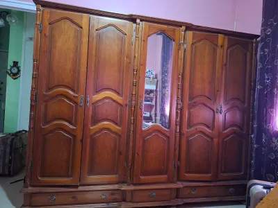 Bonjour À vendre armoire 5 portes en bois rouge premier choix, 2,4m largeur, 2m hauteur et 52cm profondeur, en bon état, 15000da. A récupérer de Alger centre.
