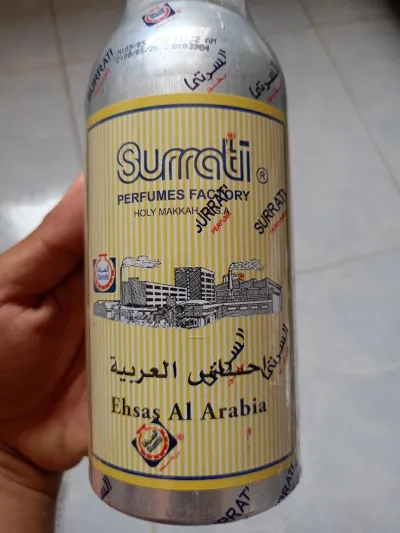 المنتج: عطر "إحساس العربية" من مصنع السُّرتي للعطور. المصدر: مصنع السُّرتي للعطور، مكة المكرمة. الحجم : 500غ