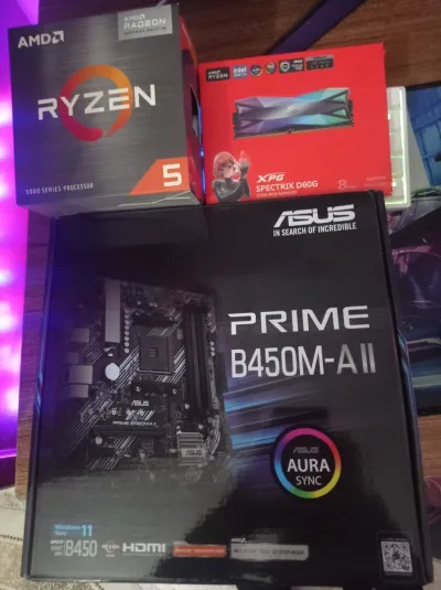 ryzen 5 5600g + cooler master fan red mother bored:asrock b450 hdv ram:ddr4 3200mhz 8*2 ssd: adata 500gb psu:meta v450 w case :spirit of gamer death match blue