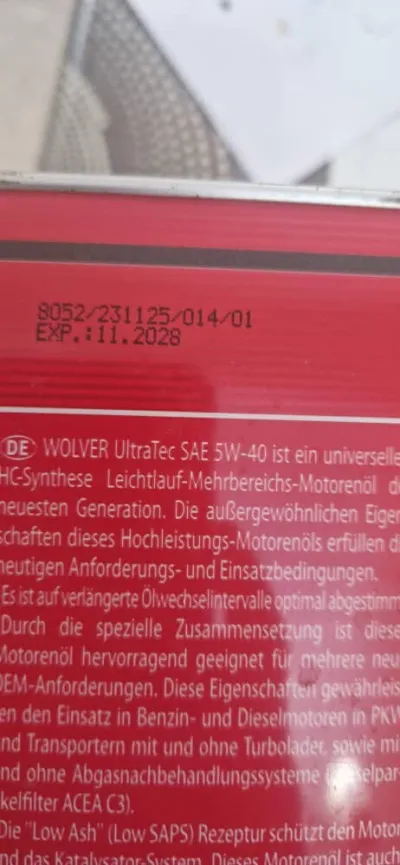 Huile moteur 5W40 C3 5L marque WOLVER d'origine Germany. Référence VW 505.01 / 502.00 / 505.00 Référence MB 229.51 / 229.31 / 229.52 Référence BMW Longlife-04 . Référence PORSCHE A40