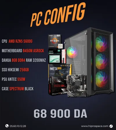 Unite game / gaming pc / config AMD RZN5 5600G . Carte Mere B450M-hdv Asrock DDR4 8G 3200Mhzdahua . DISQUE DUR SSD SATA III 3 ,2.5" 256 GO HIKSEMI / alimentation 550W Antec / CASE SPECTRUM f