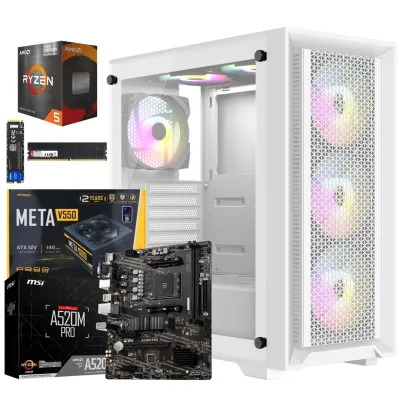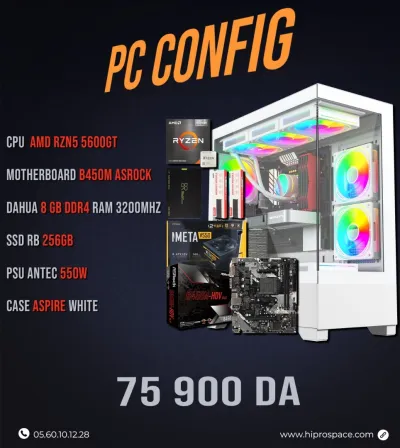 Unite Gamer AMD RZN5 5600GT/CM A520M/DDR4 8G 3200Mhz/NVME dahua 256GB /PSU 550W/CASE SPECTRUM full White plus 4Pcs Fan 12cm ARGB + Controller 10 sorties . livraison 58 wilaya . Le paiement s