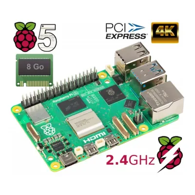 Caractéristiques techniques principales du Raspberry Pi 5 (8GB) : Processeur : Quad-core ARM Cortex-A76 cadencé à 2,4 GHz, offrant des performances améliorées par rapport aux générat