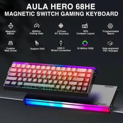 65% Wired Gasket-mounted Gaming Keyboard with Hall Effect Switch 68 keys, compact layout Advanced Magnetic Switches Various key functions Remarkable 8000Hz polling rate South-facing RGB Back