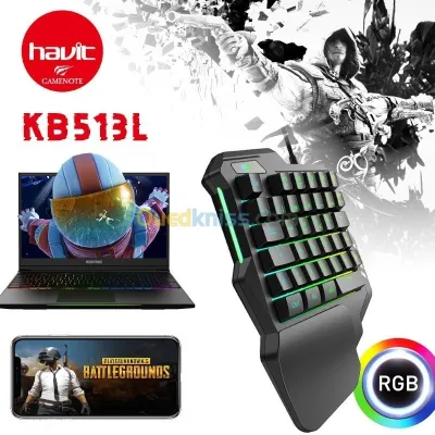 Clavier Gaming Havit KB513L One-Hand RGB Inerface USB -Type d’interface: USB - Taille: 173*230*37mm - Nombre de clé: 35 clés - Tension de fonctionnement: 5V - Durée de vie de la clé:
