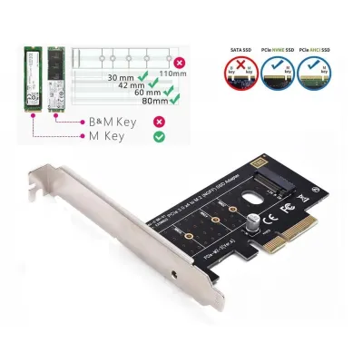 Adaptateur PCI Express 4X vers M.2 (Clé M) – SSD NGFF 🔧 Fonctionnalités : Interface : PCI Express 4X Slot d’extension : M.2 Clé M uniquement Compatibilité : SSD PCIe NVMe M.2