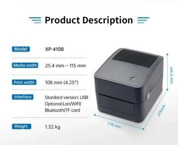 Modèle : XP-410B Méthode d’impression : Thermique directe (pas d’encre ni toner) Résolution d’impression : 203 DPI Vitesse d’impression maximale : 152 mm/s (≈ 6″ par seconde)