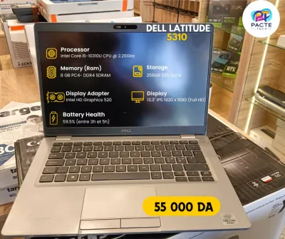 DELL LATITUDE – PC PORTABLE État : Occasion – Très bon état Prix : 55000 DA Caractéristiques : Processeur : Intel® Core™ i7-8665UU @ 1.90 GHz (Turbo 4.80 GHz) Cœurs : 4 Thread