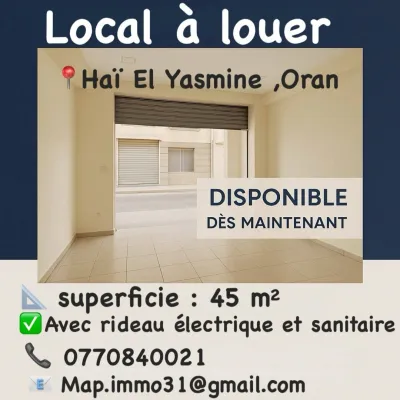 🌟 Local Commercial à Louer à Oran – Hai El Yasmine 🌟 📍 Emplacement : Hai El Yasmine, Oran 📐 Surface totale : 60 m² 🚪 Équipement : 2 rideaux électriques ✅ État : Fin