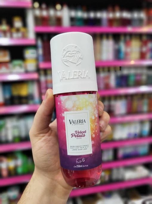 une brume parfumée pour le corps de la marque Valeria. Nom du parfum : Velvet Petals Contenance : 250 ml / 8,4 fl oz Marque : Valeria, avec un logo en relief sur le capuchon blanc Des