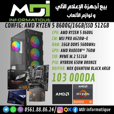 CPU: AMD RYZEN 5 8600G CM: MSI PRO A620M-E RAM: 16GB DDR5 5600MHz GPU: AMD RADEON™ 760M SSD: NVME M.2 512GB PSU: HYBROK 650W BRONZE BOITIER: NOX QUANTUM BLACK ARGB