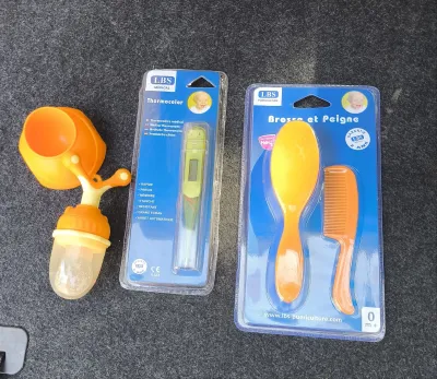 A vendre lot neuf de 490 pièces de puériculture composé de: - Thermomètre, - Peigne/Brosse, - Grignoteuse pour apprendre au bébé a manger sans s'étouffer Prix: 300da la pièce, minim