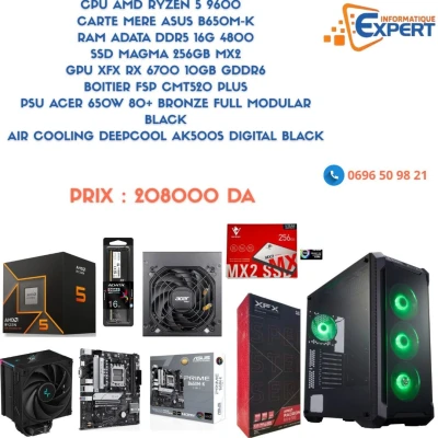 CPU AMD RYZEN 5 9600 CARTE MERE ASUS B650M-K RAM ADATA DDR5 16G 4800 SSD MAGMA 256GB MX2 GPU XFX RX 6700 10GB GDDR6 BOITIER FSP CMT520 PLUS PSU ACER 650W 80+ BRONZE FULL MODULAR BLACK AIR C