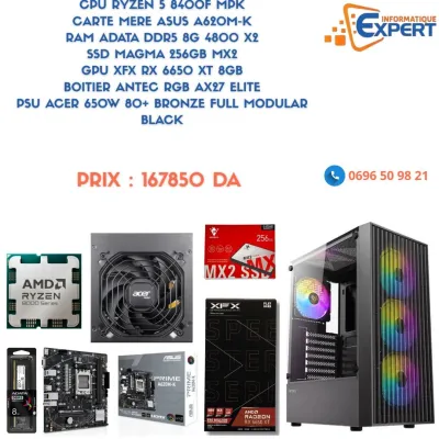 CPU RYZEN 5 8400F MPK CARTE MERE ASUS A620M-K RAM ADATA DDR5 8G 4800 X2 SSD MAGMA 256GB MX2 GPU XFX RX 6650 XT 8GB BOITIER ANTEC RGB AX27 ELITE PSU ACER 650W 80+ BRONZE FULL MODULAR BLA