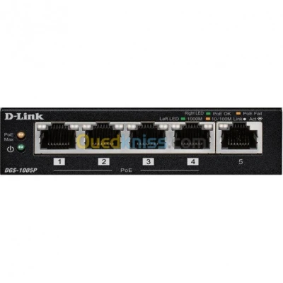 switch 5 ports Gigabit dont 4 ports supportant le PoE/PoE+ DGS‑1005P 5 ports Gigabit Ethernet (4 ports PoE+) PoE+, bilan énergétique 60W Matrice de commutation 10 Gbit/s switch 5