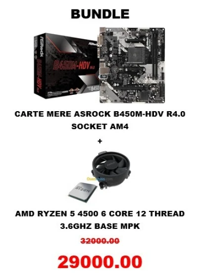 BUNDLE CARTE MERE ASROCK B450M-HDV R4.0 AM4 + AMD RYZEN 5 4500 6 CORE 12 THREAD 3.6GHZ BASE MPK * CARTE MERE ASROCK B450M-HDV R4.0 SOCKET AM4 * AMD RYZEN 5 4500 6 CORE 12 THREAD 3.6GHZ BASE