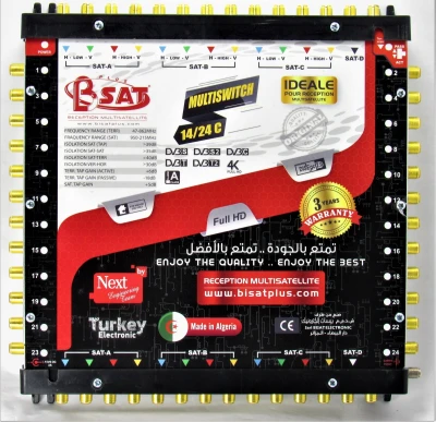 Multiswitch Bisat 14/24 pour 3 satellites avec 24 participants (convient uniquement pour les LNB Quattro) Il est conçu pour recevoir 4 k Ultra HD Full HD 3D qualité HD. Il a une faible per