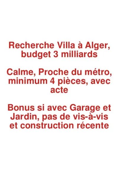 Cherche Villa finie à Alger ne dépassant pas 4 milliards Critères: - Quartier calme et proche d'une station de métro (Même si en cours de réalisation, comme Baraki ou Oued Smar) - Au