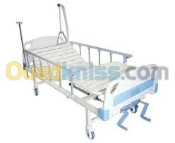 Lit médicalisé en ABS, un dossier et relève jambes articulés par manivelles multi-positions, montants en PVC, support en PVC arrondi, une barrière de sécurité en aluminium retractable