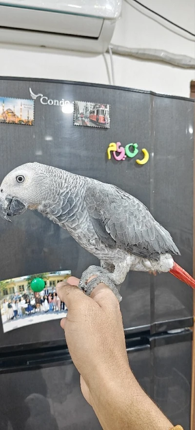 Perroquet Gris du Gabon +3 ans Grabd gabarit, plumage complet En cours de Dressage : ne mord pas, ne crie pas, mange de la main, Siffle et chante très bien le matin Ne sort pas encore de