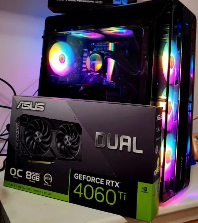 •CPU: Intel i5-14400f •GPU: Asus Rtx 4060 Ti (8Gb) •Motherboard: Gigabyte B760M Gaming DDR4 •Ram: 32GB DDR4 3200Mhz (16×2) •SSD: 512GB •WaterCooling: Raidmax LS240 ARGB •PSU: