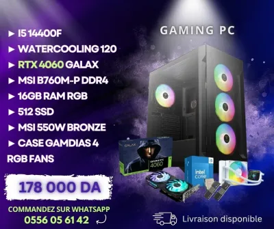 Gaming PC , NEW NEVER USED i5-14400F RTX4060 GALAX 8GB B760M-P DDR4 Watercooling 120 1 FAN MAGMA 16GB (8x2) 3200MHZ RGB 512GB SSD 550W MSI 80+ BRONZE CASE Gamdias 4 FANS RGB Neuf sous emba