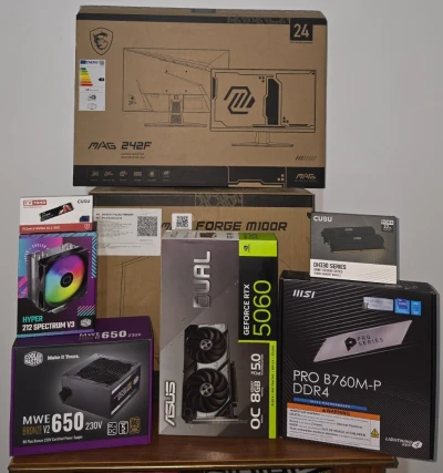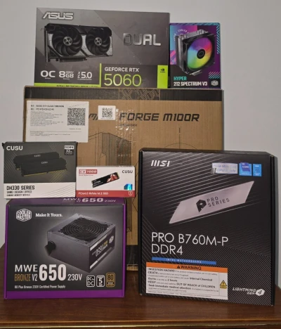 CPU : Intel i5 14400F Box Diva 10 coeurs Ram : 16gb HIKSEMI 3200MHZ GPU : RTX 4060 Zotac Gaming 8gb vram Motherboard : Msi B760M-P DDR4 Alimentation : 650w+80 BRONZE Hybrook Boitier : Galax