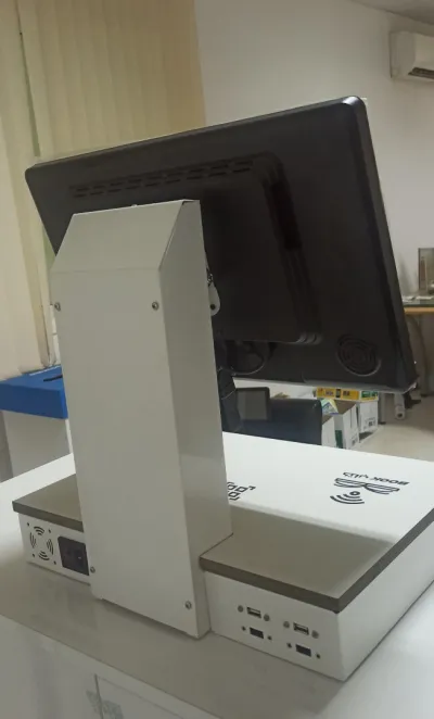 Une station de travail desktop équipée de lecteurs RFID UHF, RFID HF et code barres pour le traitement des livres dans les bureaux de la bibliothèque, la workstation desktop est un outil