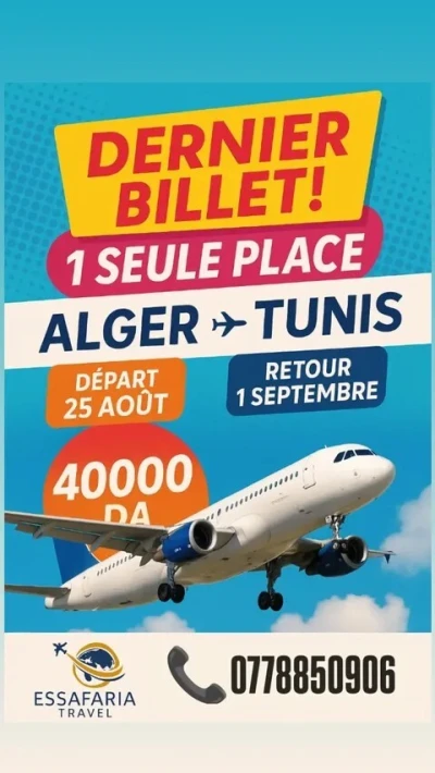 ✈️ DERNIÈRE PLACE DISPONIBLE 📍 Alger → Tunis avec Air Algérie 📅 Départ : 25 Août – Retour : 1 Septembre 🔥 Ne ratez pas ce dernier billet ! Avec ESSAFARIA TRAVEL 🌍 �