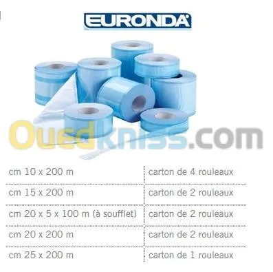 GAINE DE STERILISATION Eurosteril® Rouleaux pour stérilisation STERILITE JUSQU'À 6 MOIS Marque: EURONDA Type: EUROSTERIL Origine: Italie Rouleaux pour stérilisation en papier médic