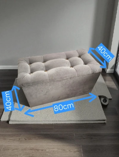 Coffre ottoman en tissu gris avec rangement intérieur - Dimensions : 80cm x 40cm x 40cm (environ) - Couleur : Gris - État : Bon état général, capitonnage intact - Rangement : Coffre spa