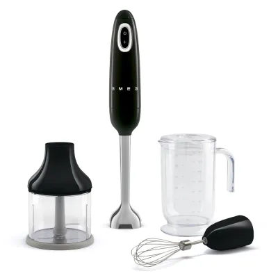 Le pied mixeur HBF03BLEU de SMEG avec accessoires Années 50 combine une esthétique rétro avec une finition brillante en noire, un corps en plastique élégant, et un pied ainsi que des la