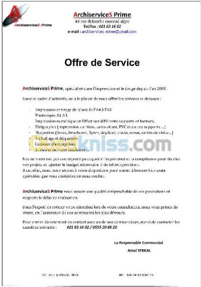 Objet : OFFRE DE SERVICE Chère Madame, Monsieur, Notre entreprise, implantée à Tizi-Ouzou, est spécialisée dans le secteur Impession Numerique et Typo-O