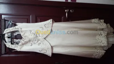 Je vends un ensemble blanc haut corset et jupe avec bernous en mousline perlé sur les bords de marque samira pour marié jamais porté à prix bradé