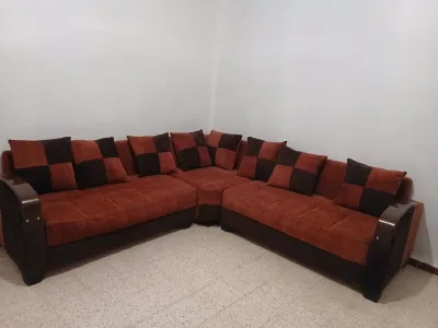 Très peu servi , oreiller réversible, tissus anti-taches Accoudoirs bois rouge Pas d'escalier, facile pour venir le chercher . Visible a el kerma