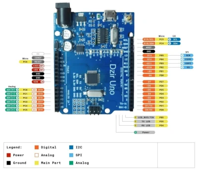 Board Name DzirUno Microcontroller ATmega328P USB connector USB Micro B Pins Built-in LED Pin 13 Digital I/O Pins 14 Analog input pins 6 PWM pins 6 Communication UART Yes I2C Yes SPI Yes P