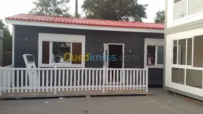 chalet en bois a vendre type F3 (60m) avec une terrasse (12m), fini clé au main, démontable et transportable en deux modules, meublé et aménagé avec l'électromenager et climatisé et a