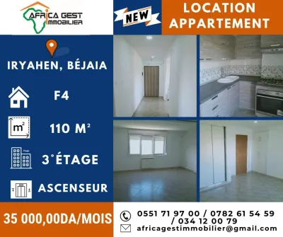 (Réf : LA/647) 🏡 Location Appartement F4 – Béjaïa, Iryahen À seulement 15 mètres de la RN75, dans un cadre familial, calme et sécurisé, Africa Gest Immobilier vous propose en l