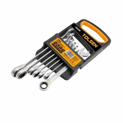 Jeu de 7 clés à cliquet combinées à tete fixe 15229 • Chromé, finition satinée • Emballage : cintre en plastique avec étiquette de couleur